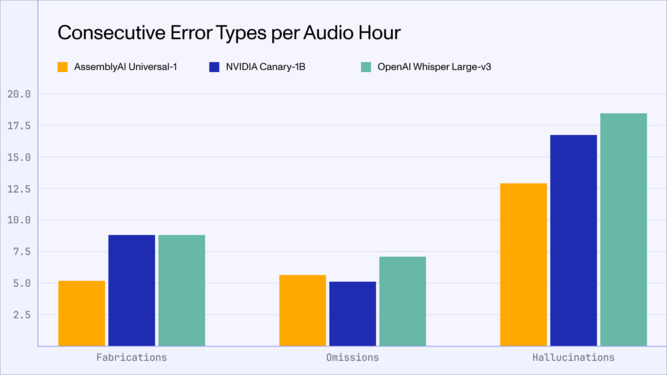 - Universal-1 reduces hallucination rate by 30% on speech data and by 90% on ambient noise, over a widely used open-source model, Whisper Large-v3, providing customers with confidence in their transcripts. [Link]