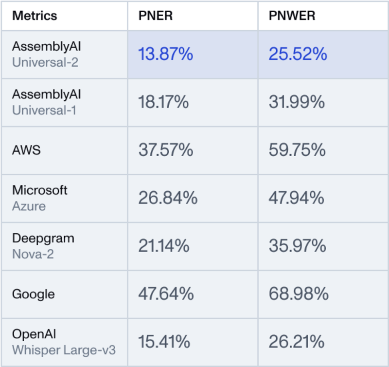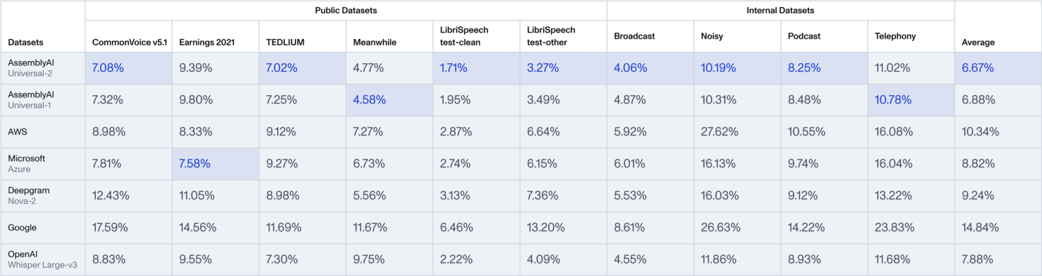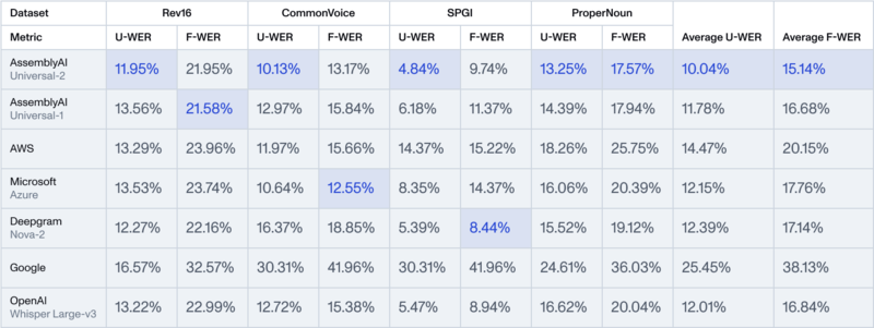 - Best-in-class accuracy: Universal-2 maintains the leading position in standard ASR accuracy established by Universal-1, outperforming Universal-1 by 3%, and exceeding the next-best system we tested—across both open-source models and Speech-to-Text providers—by 15%.