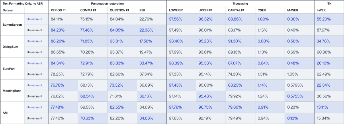 - Accurate formatting and casing: Universal-2 creates highly readable transcripts, demonstrating up to a 14.8% improvement over Universal-1 in formatting accuracy and achieving state of the art results in truecasing and inverse text normalization accuracy