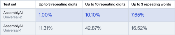 Following the release of Universal-1, we conducted an extensive evaluation of the model across a wide range of Speech-to-Text use cases. One area of particular interest to our customers is the accurate recognition of consecutive digits, or more broadly, alphanumeric strings, which is critical to properly transcribing phone numbers, license plates, and customer IDs. While Universal-1 performed well overall, we observed a degradation in recognition accuracy when handling consecutively repeating digits. This degradation primarily manifested as the deletion of repeated digits. For example, the following utterance: