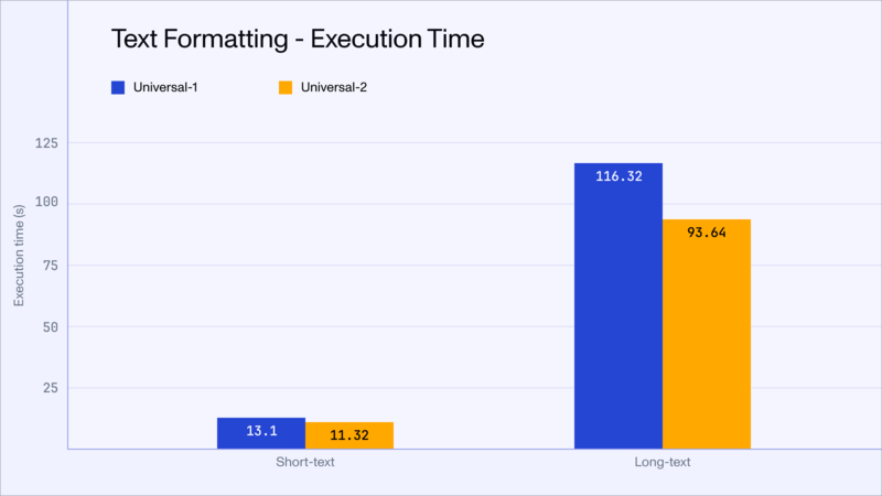 - Robustness and Efficiency: Fully neural approaches often face challenges in edge cases that weren’t adequately observed during training, and they can also be more computationally intensive. To make Universal-2’s Text Formatting model robust and efficient at scale, we’ve designed it to maintain a similar computational cost to Universal-1, with enhanced robustness even in challenging cases.