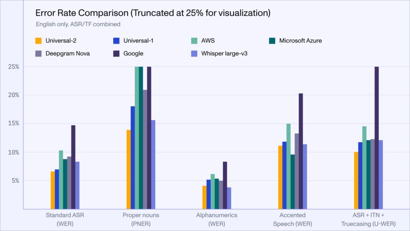 Fig. 2: This bar chart compares Universal-2, Universal-1, commercial ASR providers, and Whisper large-v3 across several categories. Word Error Rate (WER) is used for Standard ASR, Alphanumerics, and Accented Speech. Proper Noun Error Rate (PNER) is used for Proper Nouns. The performance of “ASR + ITN + Truecasing” is evaluated using Unpunctuated WER (U-WER). To improve readability, bars are truncated at 25% to minimize the impact of outliers.